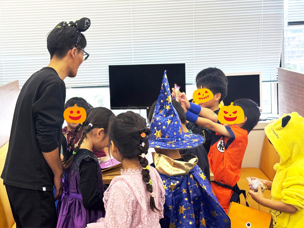 当日は、魔法使いやプリンセスなど色とりどりの衣装に身を包んだ子どもたちが、「Trick or Treat!」と、元気に英語で挨拶しながら社内をまわりました。
